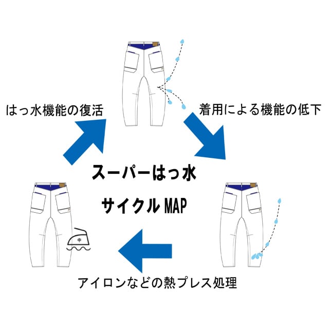 スーパー撥水加工は、上記のように着用による撥水機能低下しても、熱プレス処理をすることで再び撥水機能が復活するという優れものです。