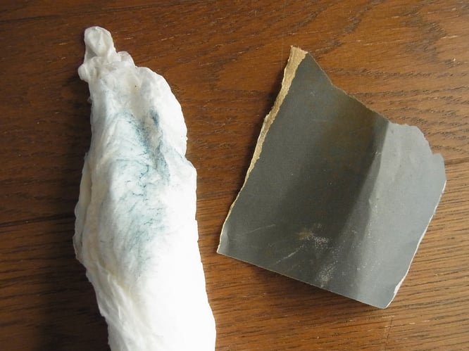 削った表面を濡れティッシュで拭きとると、削れた繊維とインディゴが付着しました。