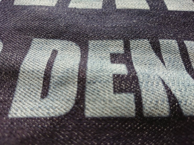 デニムの表面にレーザー照射してインディゴ染料をとばして文字を入れていきます。