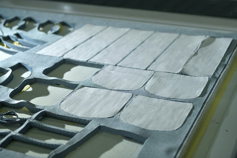 機械と手作業のハイブリッドです。裁断必要な型紙が書き込まれた紙を印刷して、生地に置き手裁断する。