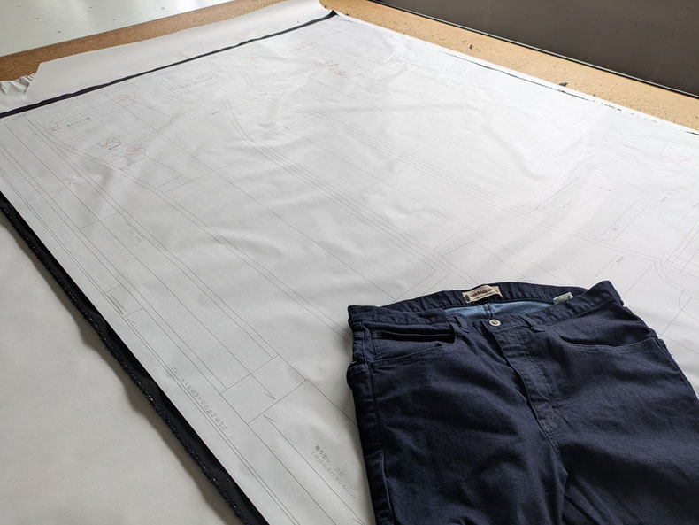 ちょうどBW-403VM,403VMBBのデニムカーゴパンツを裁断中。