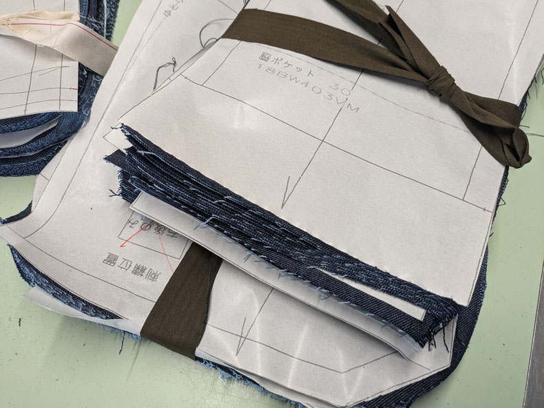 縫いあがると、次はベルトループ付けをしてもらうために特殊ミシン屋さんへ渡されます。