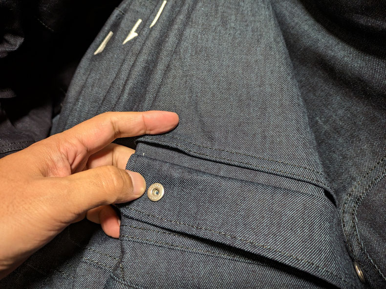 なぜボタン類がついていないかというと、撥水加工後の高温乾燥により生地が縮むから。