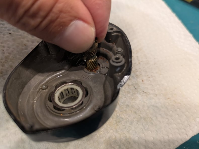 なんとかピニオンギアは外れたものの、ベアリングがボディに固着、、、、。