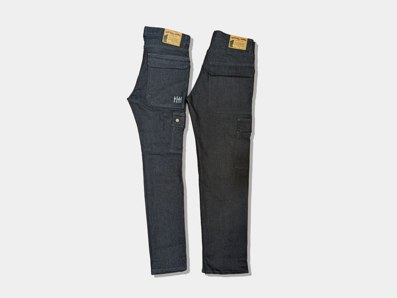 話が逸れましたが、上の写真の左がスリムカーゴパンツBW-403VM、右がレギュラーテーパードデニムカーゴパンツ。