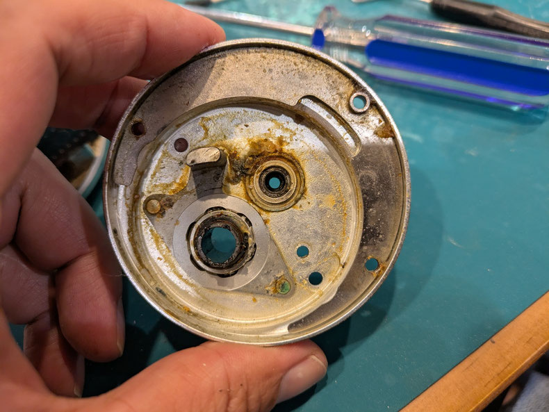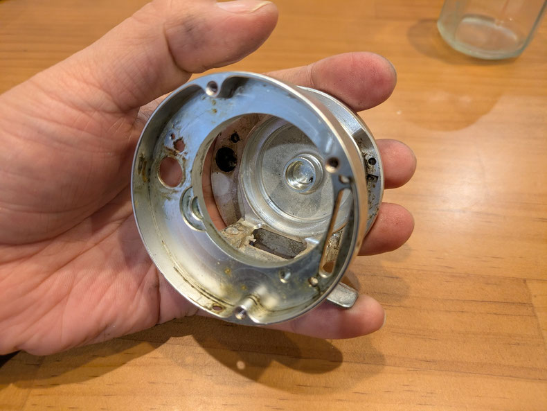 知り合いから全然巻けなくなったとのことだったのですが、ハンドルを回転させるローラークラッチがサビサビになってました。